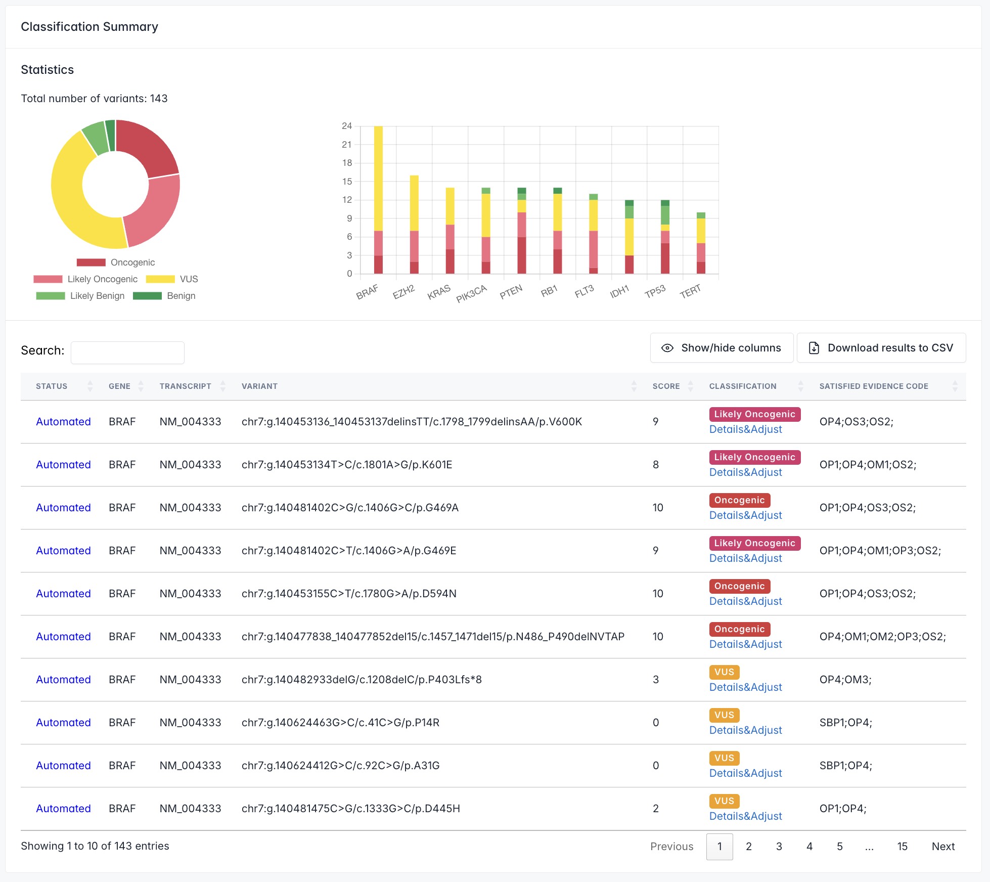The Table below lists all variants with their location and classification information. The STATUS indicates whether the classification is 'Automated' (system-generated) or 'Adjusted' (manually modified by the user). Use the search box in the table's top-left corner to filter table content globally. To review or adjust how a specific variant meets the 17 classification criteria, click its corresponding Details & Adjust link. This will navigate you to the Classification Details page.