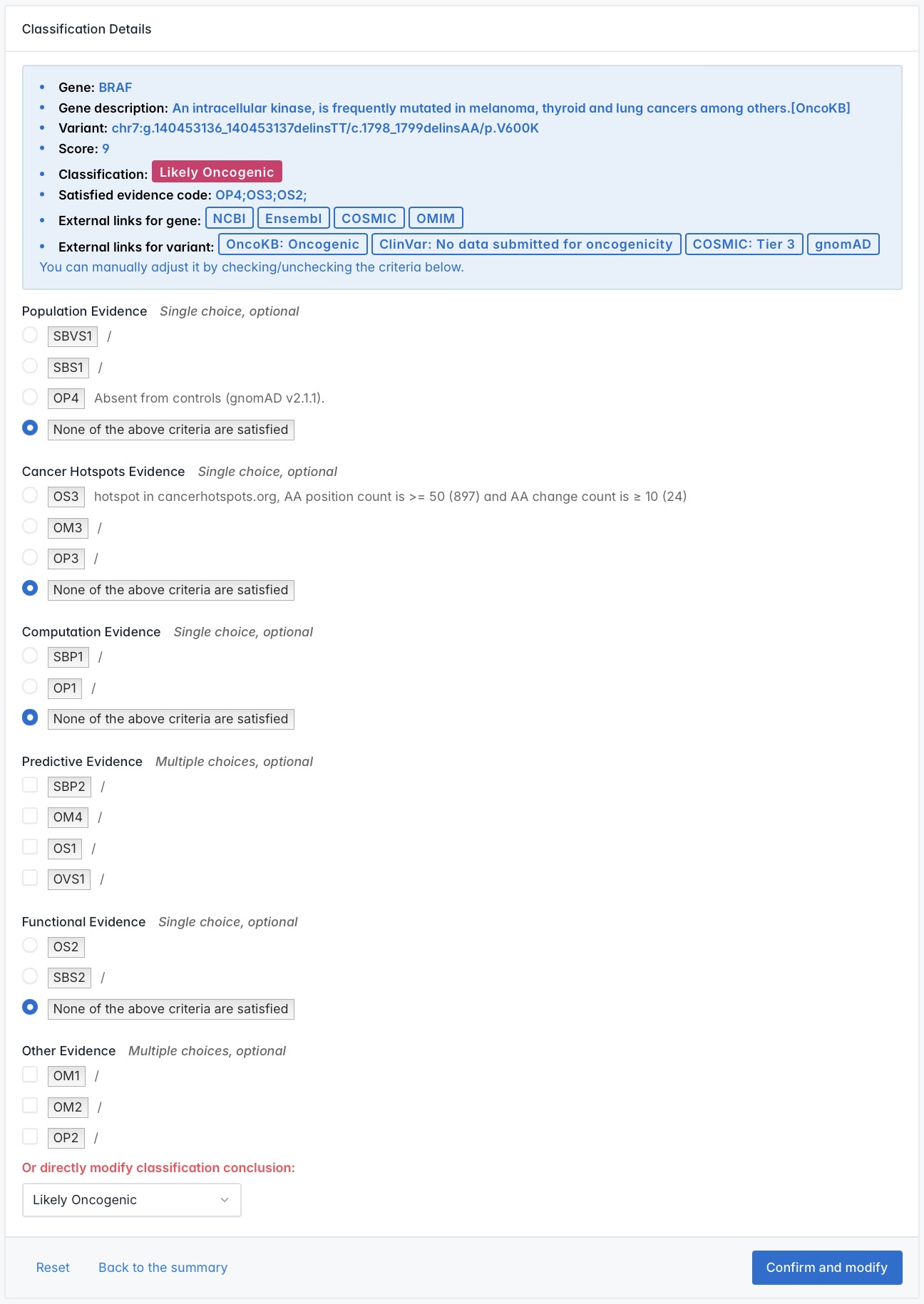 SVOC automatically scores all 17 criteria and calculates the total score of the variant based on the applicable rules defined in the guidelines (e.g., OM1 cannot be used if OS1 or OS3 is applicable). The oncogenicity category is then assigned according to the total score: ≥10 points for Oncogenic, 6–9 points for Likely Oncogenic, 0–5 points for VUS, -1 to -6 points for Likely Benign, and ≤-7 points for Benign.