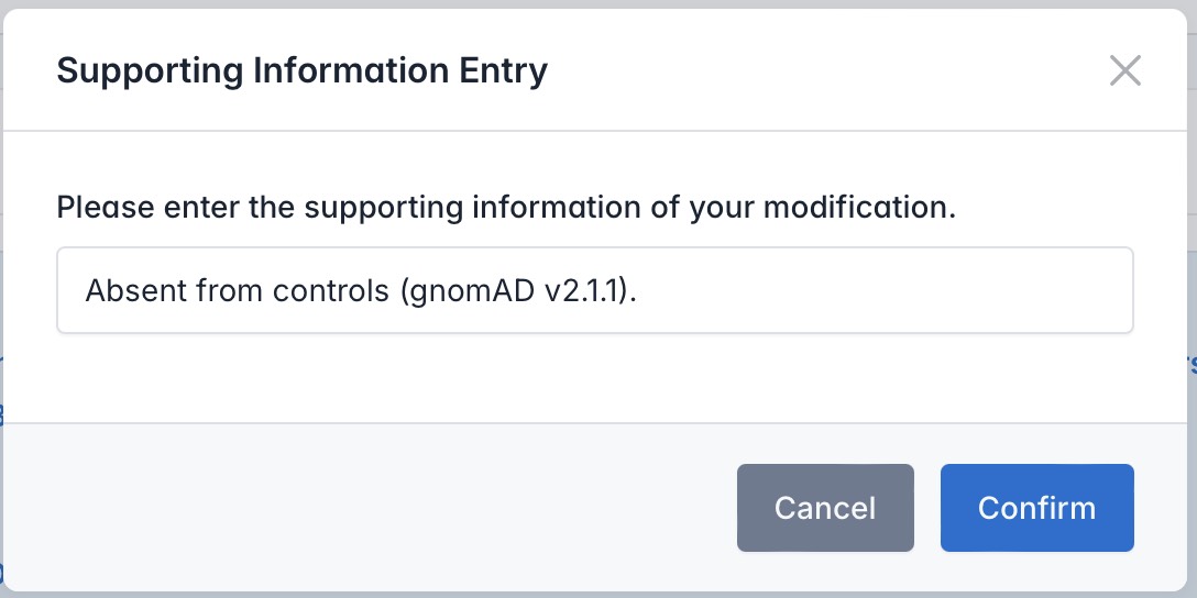 Users can adjust which criteria a variant meets by selecting or deselecting the radio buttons or checkboxes next to each standard. When changes are made, the system will prompt for supporting information. After the user provides and submits this information, the classification result will update automatically.