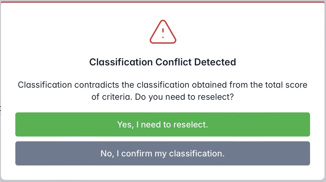 Or, users can directly modify the final classification conclusion using the dropdown menu at the bottom of the page. If the selected classification contradicts the variant's classification based on scoring criteria, the system will prompt the user to either reselect or confirm the change. Upon confirmation, the system will automatically update and apply the new classification.
