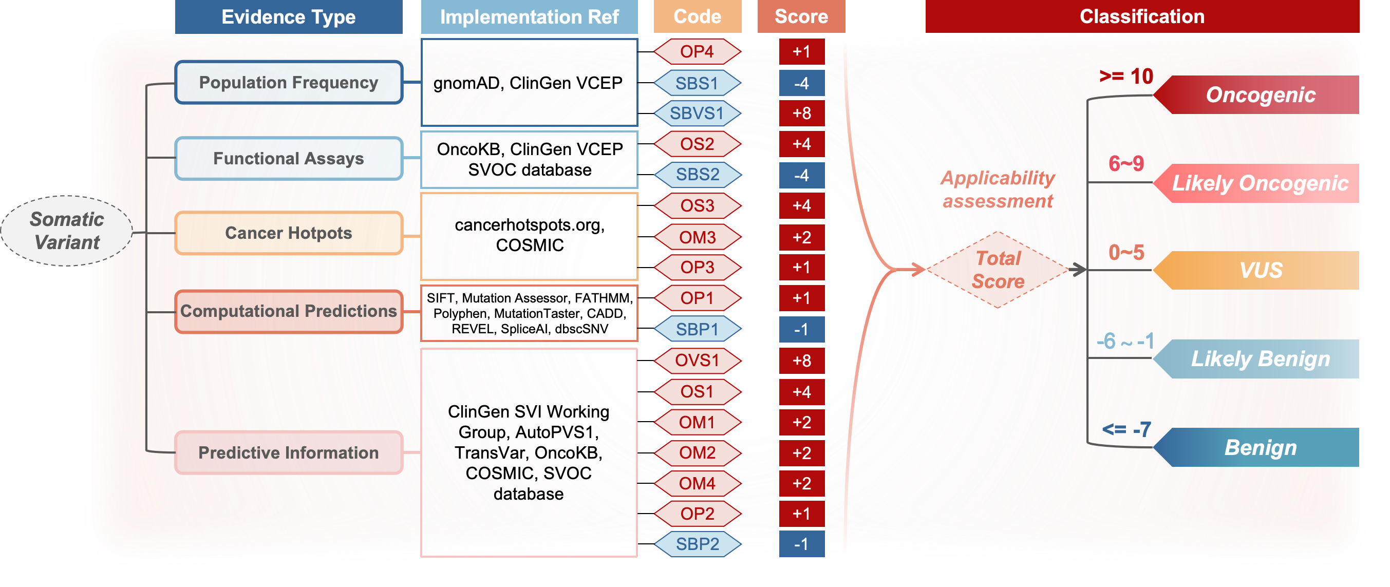 Based on these evidence, variants are classified into five categories: Oncogenic, Likely Oncogenic, Variants of Uncertain Significance (VUS), Likely Benign and Benign. There are a total of 17 criteria: 3 criteria for the population data (SBVS1, SBS1 and OP4), 2 criteria for the functional data (OS2 and SBS2) , 7 criteria for the predictive data (OVS1, OS1, OM1, OM2, OM4, OP2, SBP2), 3 criteria for the cancer hotspots (OS3, OM3 and OP3), and 2 criteria for the computational evidence (OP1 and SBP1). The prefix "OVS" represents "Oncogenic Very Strong", corresponding to 8 points; "OS" represents "Oncogenic Strong", corresponding to 4 points; "OM" represents "Oncogenic Moderate", corresponding to 2 points; "OP" represents "Oncogenic Supporting", corresponding to 1 point; "SBVS" represents "Somatic Benign Very Strong", corresponding to -8 points; "SBS" represents "Somatic Benign Strong", corresponding to -4 points; and "SBP" represents "Somatic Benign Supporting", corresponding to -1 point. SVOC assigns the corresponding points when a criterion is met; otherwise, 0 points are assigned.